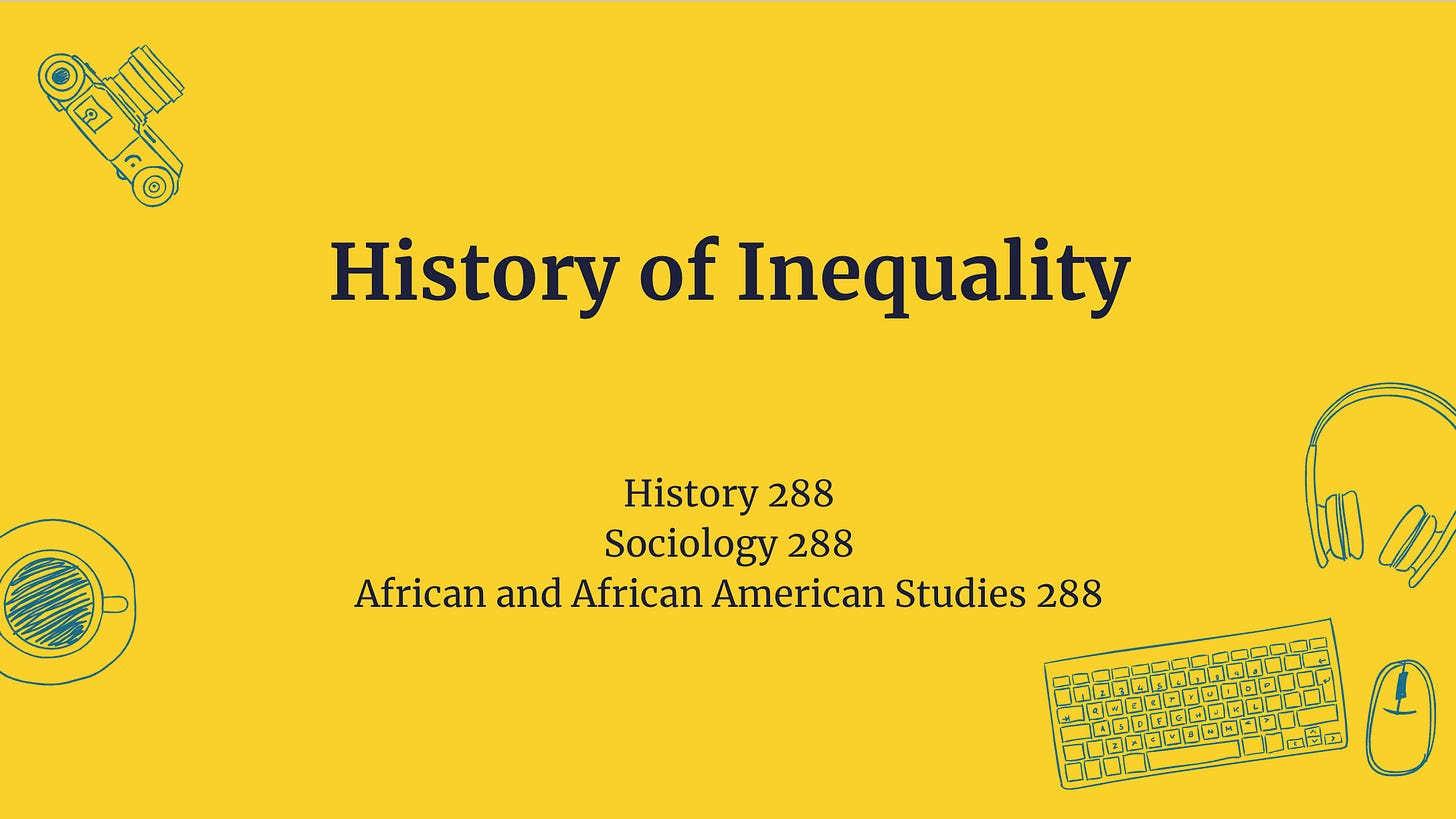 Background: As I mentioned in What Do You Teach? (Part One), in 2020 the Cook Center and the History Department created Duke’s new Inequality Studies minor. I organized this effort and, in 2021, designed and taught two new minor courses, one of which was History of Inequality.